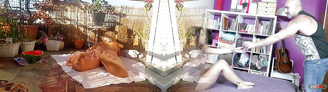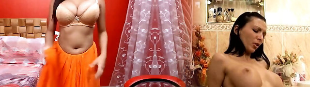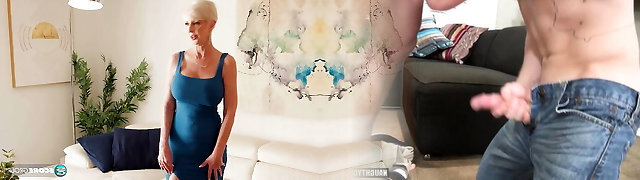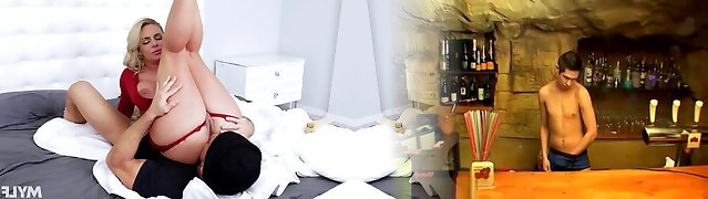 The beautiful, Brazilian chic, Charley Chase sits on her leather couch, showing off her cleavage and smooth gams to her enjoy