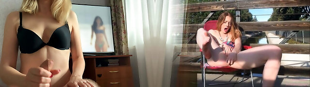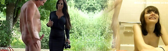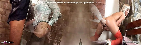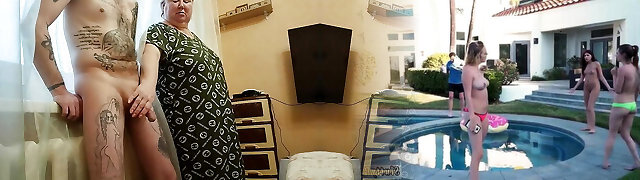 sporca milf bionda in lingerie & un cappotto di pelliccia ama guardare un vagabondo si masturba nudo davanti a lei
