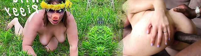 un maiale nudo, strisciando sul prato, grugnendo, mette i denti di leone nella sua lanosa backdoor