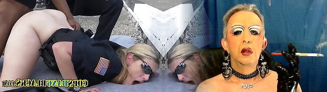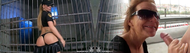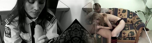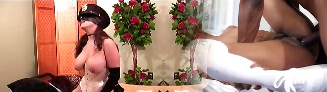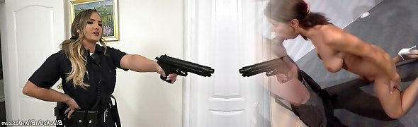con i capelli scuri e miele è vestito in un pazzo agente di polizia uniforme mentre ottenere sbattuto da dietro