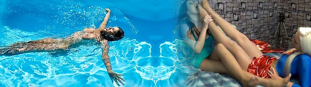 Two killer girls swimming naked in a pool