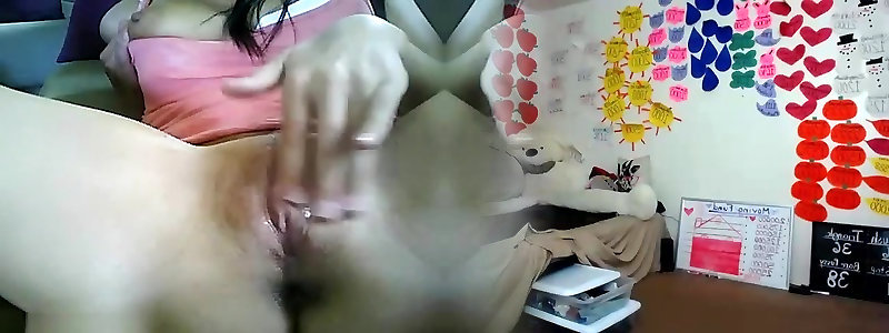 Dark haired female plays with her superwet clean-shaven vagina macro shot on the sofa