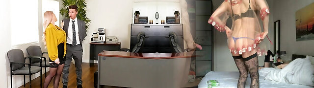 Supah Hot Blonde Assistant in Panythose and Lace Panties on High Heels gets fucked by Big Dick Boss at Workplace for cum