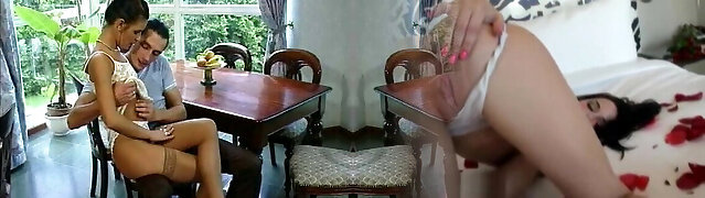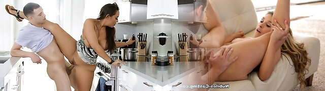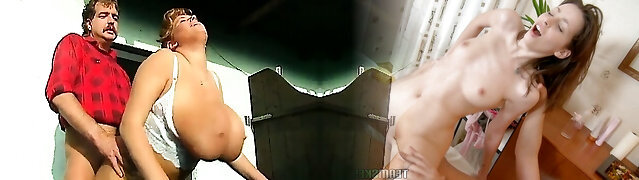 Good-sized-titted German chicks gets plowed by two dude's in the kitchen